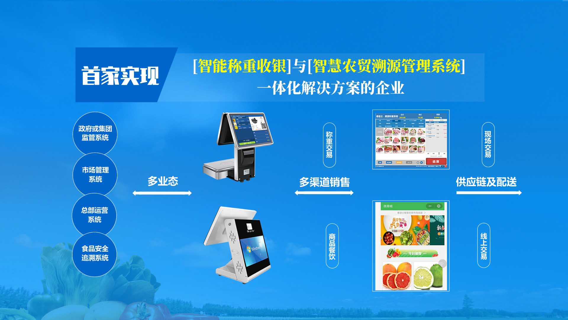 創(chuàng)新實現(xiàn)了【智慧農(nóng)貿(mào)溯源管理系統(tǒng)】與【智能稱重收銀】一體化解決方案,集市場管理、運營管理、溯源追溯、智能收銀大數(shù)據(jù)運用于一體,硬件、軟件與管理系統(tǒng)完美結(jié)合。適用于農(nóng)批、農(nóng)貿(mào)市場蔬菜、生鮮、水果、水產(chǎn)、肉類、熟食等稱重和非稱重銷售;由于采用一體化設(shè)計,解決了傳統(tǒng)農(nóng)貿(mào)市場無法實現(xiàn)的信息化、智能化、可追溯的管理問題;使稱重、收銀、追溯、管理、更透明、公正、安全,讓顧客無后顧之憂,給管理工作帶來極大的便捷與高效,對國內(nèi)農(nóng)產(chǎn)品行業(yè)的發(fā)展、農(nóng)產(chǎn)品流通管理起到了典范作用。 【睿途士首創(chuàng)】顛覆傳統(tǒng)的“智慧農(nóng)貿(mào)市場系統(tǒng)”,解決了傳統(tǒng)農(nóng)貿(mào)系統(tǒng)單一安卓掛屏,昂視不方便看、不直觀、無互動性,傳輸信息不齊全、不穩(wěn)定的問題,也解決了按鍵電子秤商品難找、商品代碼難記、按鍵操作不靈活、支付不智能,對收銀管理、銷售商品、菜名、菜價、打折、優(yōu)惠、會員、線上下單、采購等無法實現(xiàn)實際菜品交易和追溯等問題。 更具顛覆性的是睿途士智慧系統(tǒng)擁有三大管理平臺(市場管理平臺、總部運營管理平臺、商戶后臺管理平臺)、一個可視操作前臺和三大追溯功能,讓遠(yuǎn)程管理、數(shù)據(jù)傳輸、人機互動、智能控制、移動支付、大數(shù)據(jù)、互聯(lián)通信、云端存儲、人工智能、智能城市、電子定位、智能收銀等功能得以實現(xiàn)。